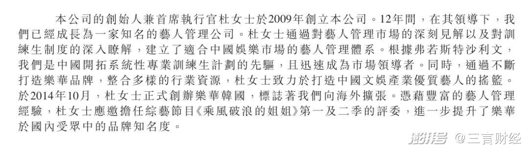 2009年,杜華創(chuàng)辦樂華娛樂,并于2014年成立樂華韓國(guó),開啟海外擴(kuò)張。此外,招股書還提到杜華曾擔(dān)任綜藝節(jié)目《乘風(fēng)破浪的姐姐》第一季、第二季評(píng)委。