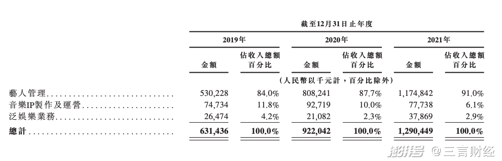 樂華娛樂的收入來源包括:藝人管理、音樂IP制作及運(yùn)營(yíng)及泛娛樂業(yè)務(wù)。2019年、2020年及2021年,樂華娛樂分別錄得收入6.31億元、9.22億元及12.90億元。其中,藝人管理為其主要收入來源,2019年、2020年及2021年分別收入5.30億元、8.08億元及11.75億元,分別占同期總收入84%、87.7%及91%。
