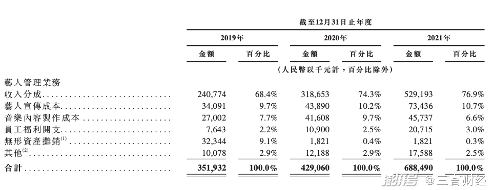 藝人管理業(yè)務(wù)的收入分成為樂華娛樂收入成本的主要部分,2019年、2020年及2021年,樂華娛樂錄得藝人管理業(yè)務(wù)收入分成分別為2.41億元、3.19億元及人5.29億元,分別占其同期總營(yíng)業(yè)成本的68.4%、74.3%及76.9%。