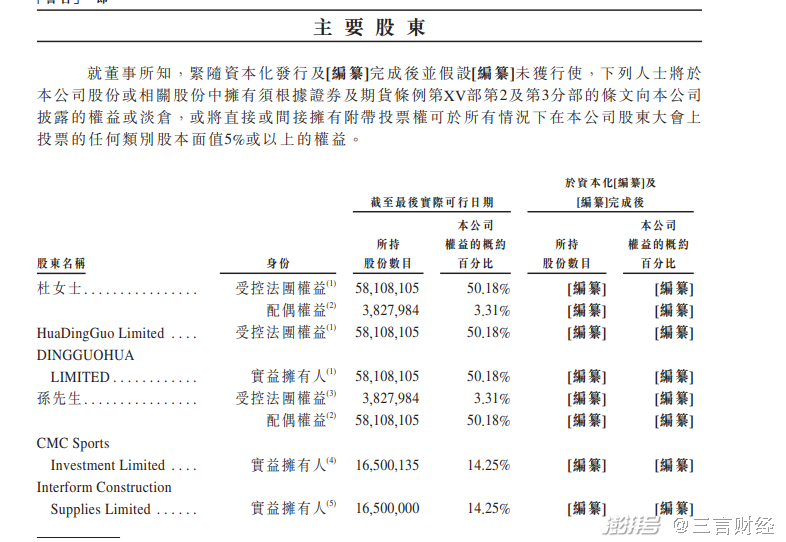 上市之前,公司創(chuàng)辦人兼董事長(zhǎng)杜華持股50.18%,阿里影業(yè)通過Interform Construction Supplies Limited持股14.25%,字節(jié)跳動(dòng)旗下公司量子躍動(dòng)通過Afflatus Limited持股4.74%,華人文化通過CMC Sports Investment Limited持股14.25%。