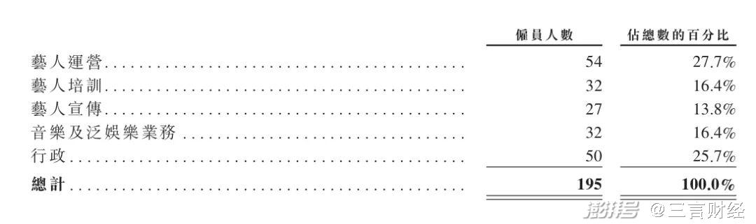招股書顯示,195名員工中,負(fù)責(zé)藝人運(yùn)營(yíng)員工數(shù)54人;負(fù)責(zé)藝人培訓(xùn)員工數(shù)32人;負(fù)責(zé)藝人宣傳員工數(shù)27人;負(fù)責(zé)音樂及泛娛樂業(yè)務(wù)員工數(shù)32人;行政方面員工數(shù)50人。
