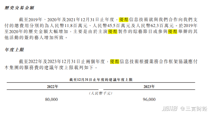 招股書還顯示,截至2019年、2020年及2021年12月31日止,優(yōu)酷向樂華娛樂支付總費(fèi)用分別為1180萬(wàn)元、4500萬(wàn)元及6230萬(wàn)元,三年共計(jì)約1.2億元。并且截至2022年及2023年12月31日兩年度,優(yōu)酷根據(jù)業(yè)務(wù)合作框架協(xié)議應(yīng)支付樂華集團(tuán)的服務(wù)費(fèi)建議年度上限分別為8000萬(wàn)元及9600萬(wàn)元。