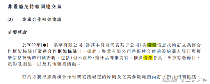 根據(jù)優(yōu)酷與樂華娛樂雙方簽訂的合作框架協(xié)議,樂華娛樂將安排合適的簽約藝人履行與優(yōu)酷的相關(guān)委聘。包括擔(dān)任品牌推薦官、推廣會(huì)員、出演綜藝節(jié)目、電影及劇集,以及其他商業(yè)活動(dòng)等。