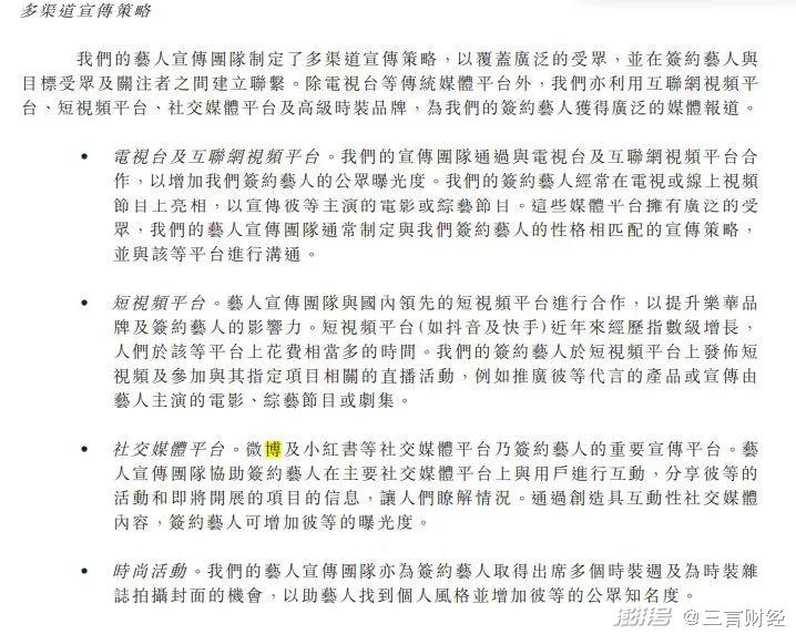 招股書表示,藝人宣傳團(tuán)是建立藝人與觀眾溝通橋梁的關(guān)鍵環(huán)節(jié)。宣傳團(tuán)隊(duì)通過發(fā)布宣傳材料來幫助藝人增加曝光率,以及在社交平臺(tái)上發(fā)布與藝人有關(guān)的新聞、動(dòng)態(tài)等。若簽約藝人面臨潛在不利宣傳,藝人宣傳團(tuán)隊(duì)還要及時(shí)作出反應(yīng)并制定適當(dāng)回應(yīng)。