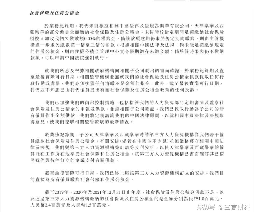 招股書透露,公司未根據(jù)相關(guān)法律法規(guī)為樂華有限公司、天津樂華以及西藏樂華的部分員工全額繳納社保及住房公積金。子公司天津樂華和西藏樂華聘請(qǐng)的第三方人力資源機(jī)構(gòu)負(fù)責(zé)相關(guān)事宜,但其并未遵守規(guī)定。