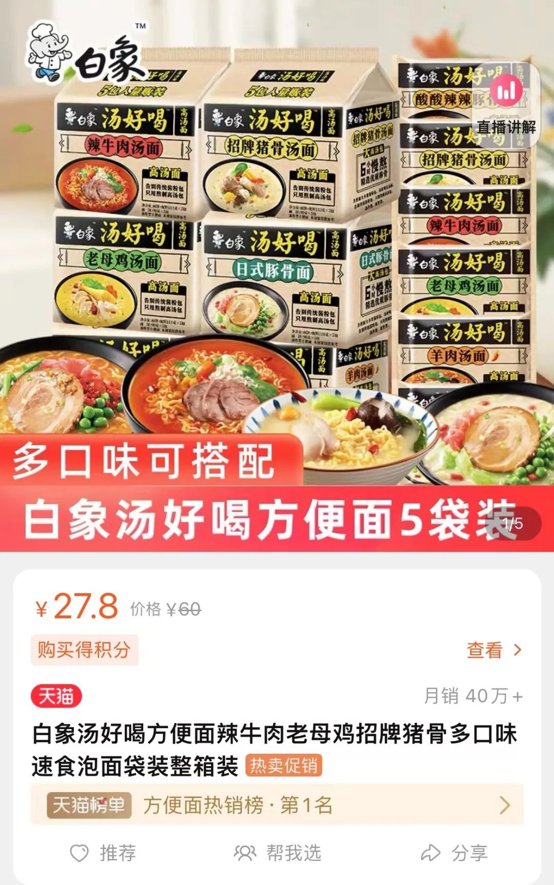 《豹變》注意到,在白象天貓旗艦店,白象湯好喝方便面的月銷(xiāo)量達(dá)到了40萬(wàn)。白象直播間也迎來(lái)了“野性消費(fèi)”,3月16日登上熱搜當(dāng)天,白象直播間的觀看人次突破6萬(wàn),比平時(shí)翻了6倍。