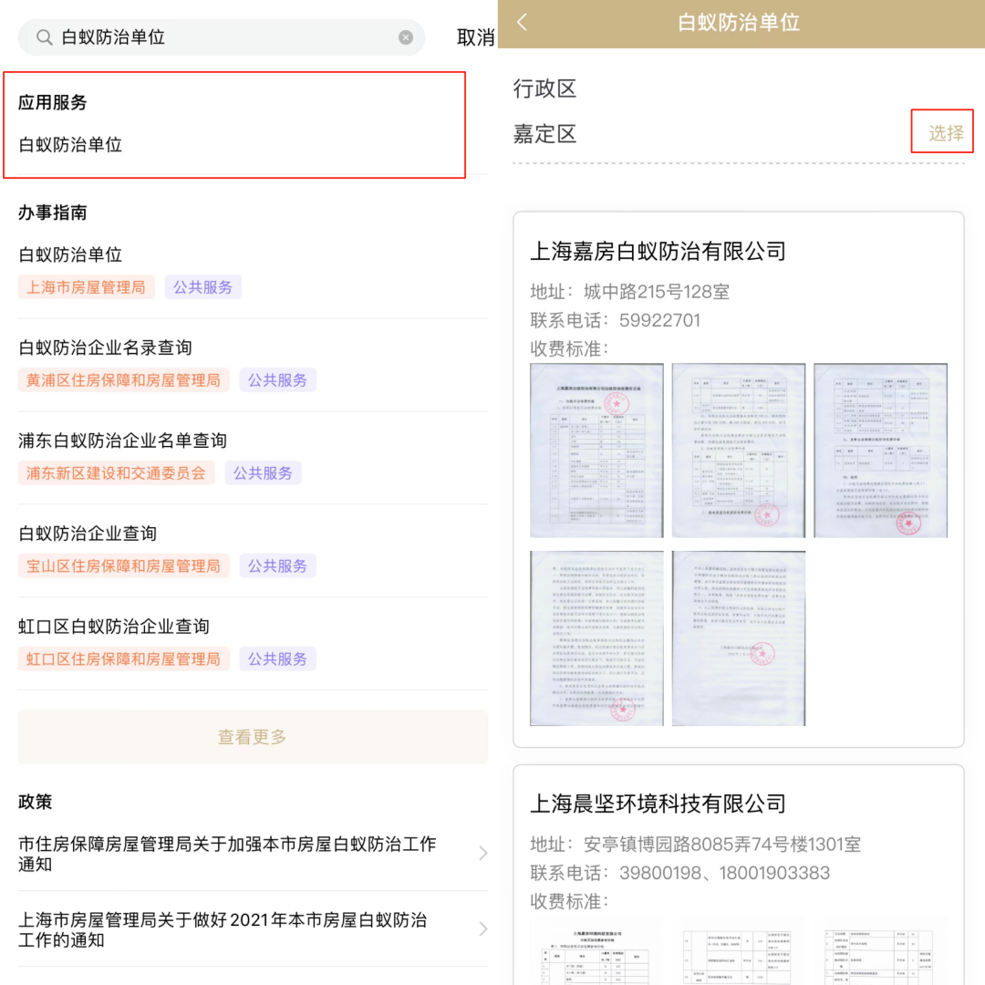 使用“隨申辦”APP搜索關(guān)鍵字“白蟻防治單位”