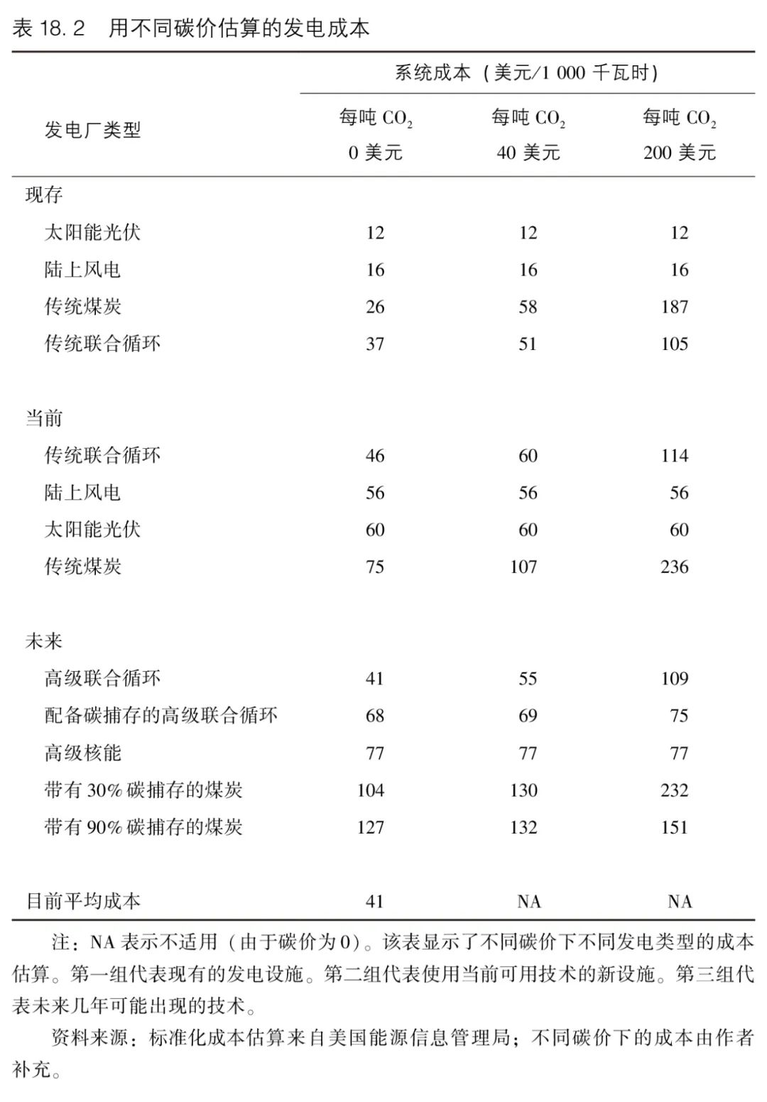 我們可以從美國目前和未來不同發(fā)電方式的成本入手?!氨?8. 2 ”顯示了能源信息管理局的估計, 為我們提供了有關(guān)美國能源的最好數(shù)據(jù)。該表顯示了當(dāng)前和未來技術(shù)下, 每1 000 千瓦時電的成本。這三列數(shù)字為包含了三種不同碳價(或碳稅)的發(fā)電成本。第一列顯示了美國和大多數(shù)國家每噸二氧化碳為0 美元時的發(fā)電成本, 這意味著沒有氣候政策。后兩列顯示了低碳價和高碳價的影響。較低的是美國政府推薦的價格(每噸二氧化碳40 美元), 而較高的是與積極減排目標(biāo)相一致的價格(每噸二氧化碳200 美元)。