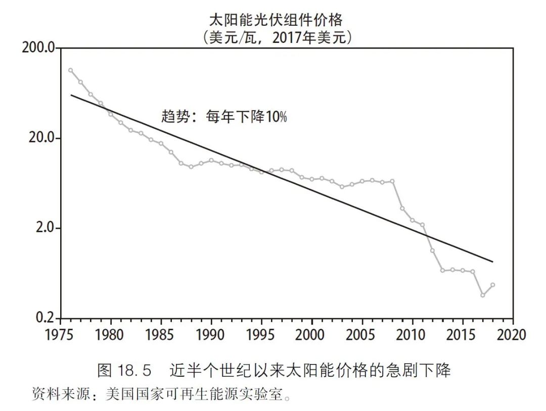 自第一批太陽能電池問世以來,其成本已大幅下降。“圖18. 5 ”顯示了光伏組件的價格變動趨勢,自1976 年以來,光伏組件的價格以每年10% 的速度下降?;仡櫛怼?8. 2 ”的內(nèi)容,在碳價適中的情況下,太陽能光伏發(fā)電可同當(dāng)今最劃算的燃料發(fā)電競爭。