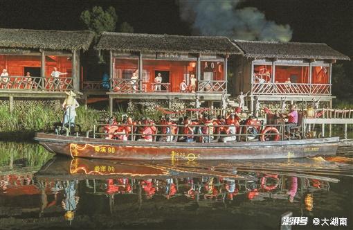 8月20日晚,常德桃花源旅游景區(qū)秦溪河畔,游客乘坐游船觀(guān)看大型溪流漫游實(shí)景演出《桃花源記》。暑假期間,《桃花源記》實(shí)景演出的人氣持續(xù)火爆,浸入式觀(guān)演模式讓游客流連忘返。郭立亮 攝