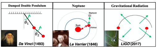 圖3. 拉格朗日神經(jīng)網(wǎng)絡(luò)重新發(fā)現(xiàn)了阻尼雙擺的摩擦力,從天王星的軌道發(fā)現(xiàn)海王星,從螺旋軌道發(fā)現(xiàn)引力波。