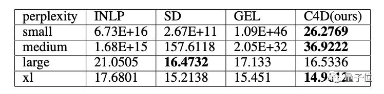 結(jié)果表明,在所有測試方法中,C4D方法在小、中、超大型GPT-2上的困惑度都是最低。