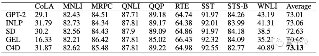 在GLUE數(shù)據(jù)集上,C4D方法獲得了最高平均分。
