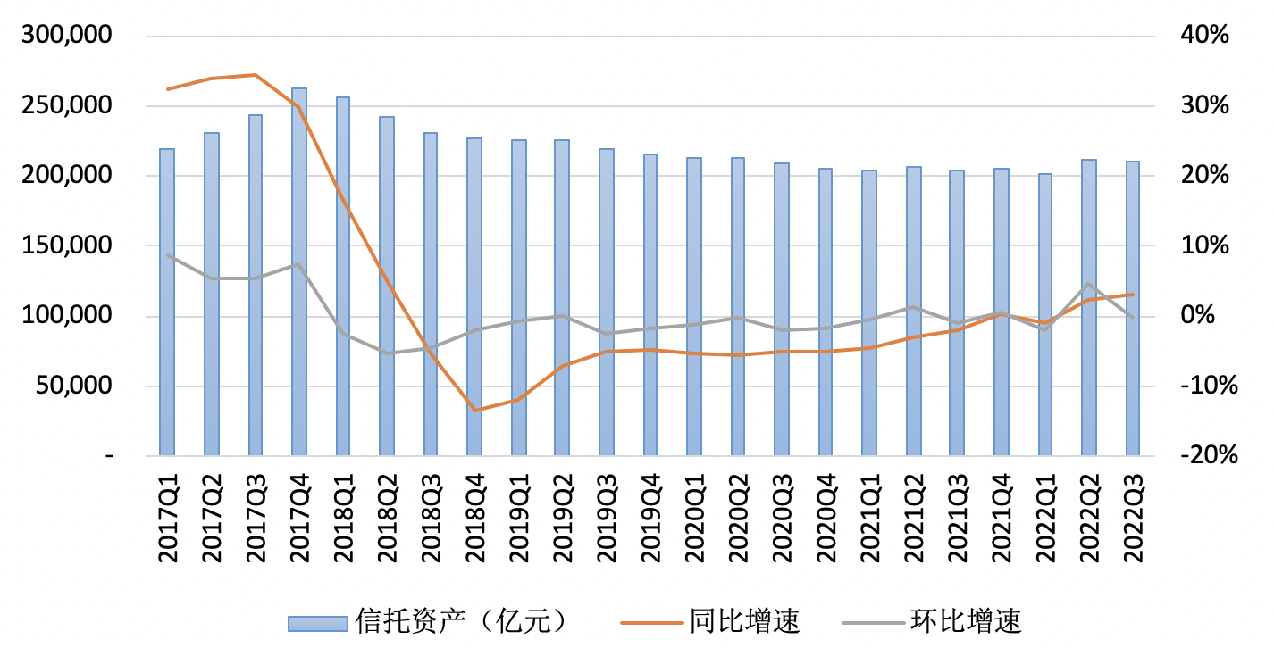 中國(guó)信托業(yè)協(xié)會(huì)官網(wǎng)發(fā)布的數(shù)據(jù)顯示,截至三季度末,信托資產(chǎn)規(guī)模余額為21.07萬(wàn)億元,同比增加0.63萬(wàn)億元,增幅為3.08%;環(huán)比略降356.3億元,降幅0.17%;與2021年末規(guī)模余額相比,增加0.52億元,增幅2.55%;與2017年末的歷史峰值相比,行業(yè)管理的信托資產(chǎn)規(guī)模下降幅度收窄至19.71%。