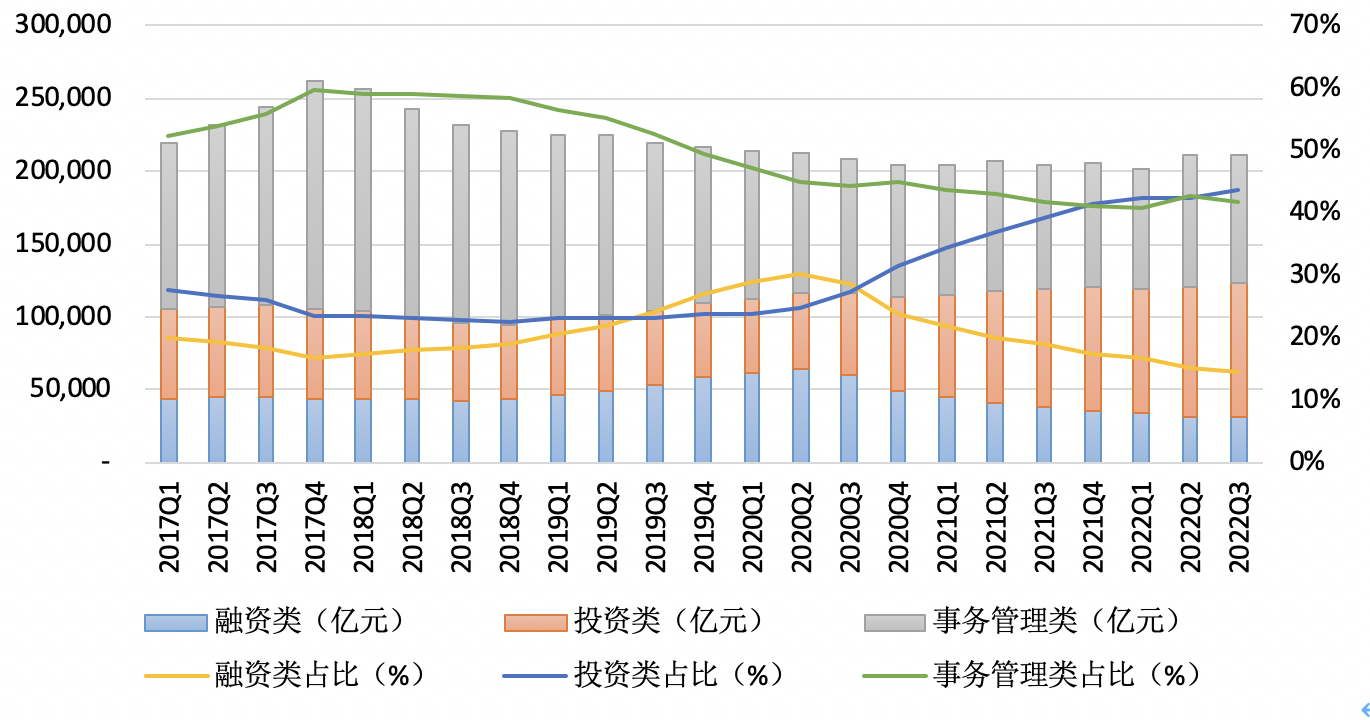 從信托資產(chǎn)功能結(jié)構(gòu)來(lái)看,三季度末,投資類信托規(guī)模為9.22萬(wàn)億元,同比增長(zhǎng)14.77%,環(huán)比增長(zhǎng)3.13%;較2021年末規(guī)模增長(zhǎng)0.72萬(wàn)億元,增長(zhǎng)8.44%;占比為43.75%,同比上升4.46個(gè)百分點(diǎn),環(huán)比上升1.4個(gè)百分點(diǎn),今年以來(lái)連續(xù)3個(gè)季度保持在信托資產(chǎn)功能分類的首位。