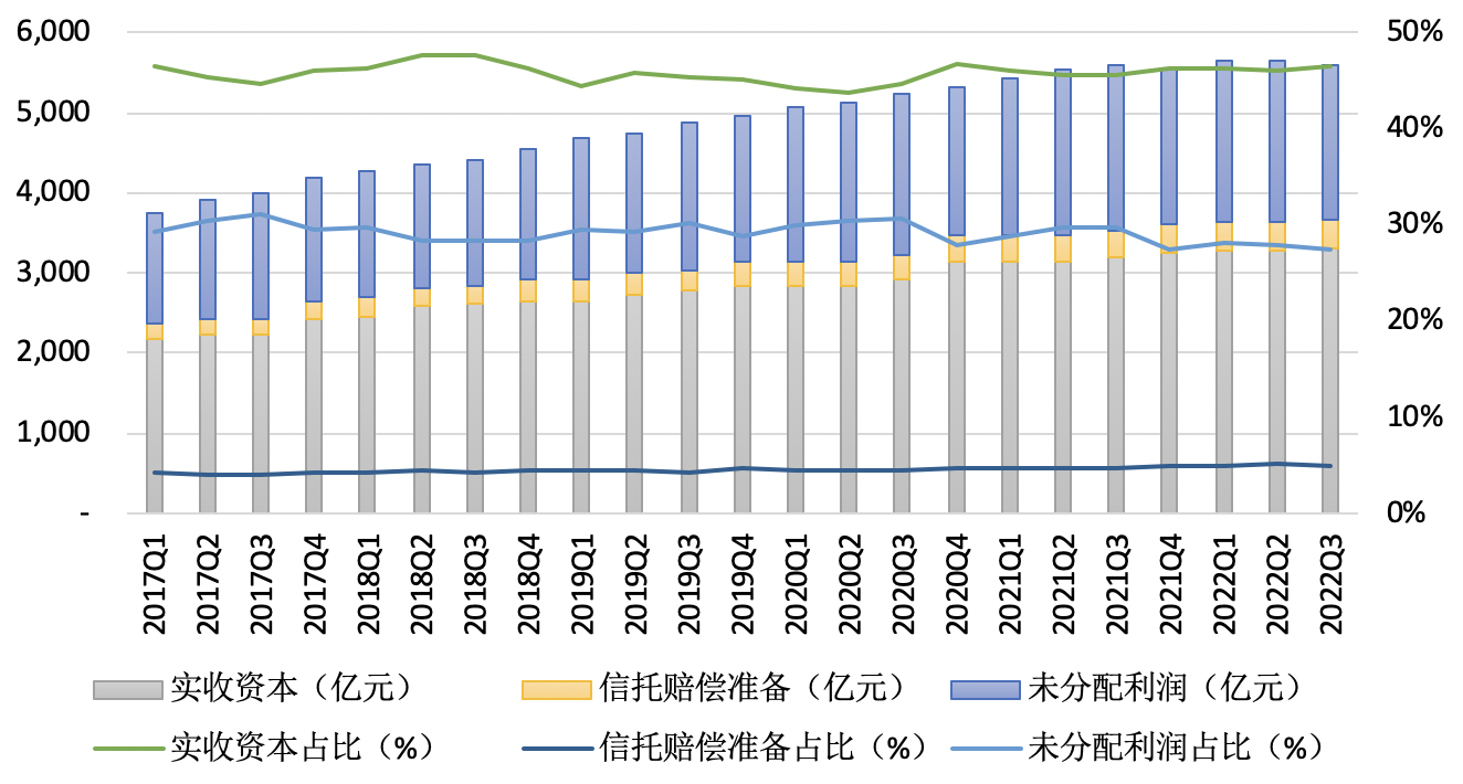 圖5 信托業(yè)所有者權(quán)益的主要構(gòu)成及占比 數(shù)據(jù)來(lái)源:根據(jù)中國(guó)信托業(yè)協(xié)會(huì)公開(kāi)數(shù)據(jù)整理