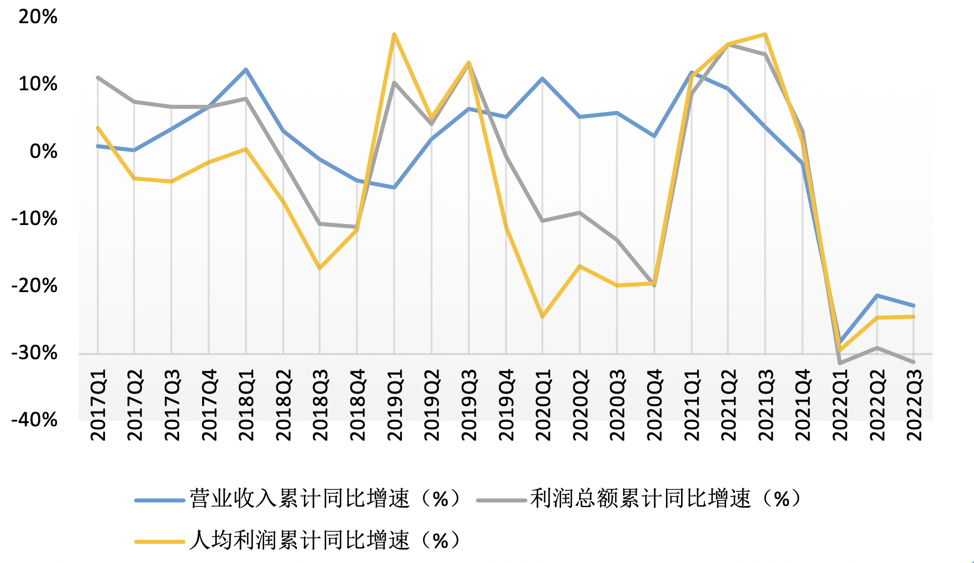 營(yíng)業(yè)收入、利潤(rùn)總額與人均利潤(rùn)同比均下滑