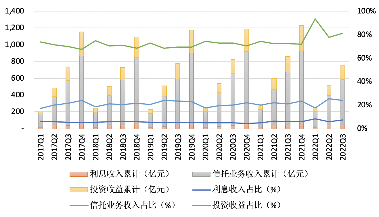 三季度末,信托業(yè)務(wù)收入在經(jīng)營(yíng)收入中的占比上升到81.32%,同比提升8.87個(gè)百分點(diǎn)。從前三季度總體情況看,信托業(yè)務(wù)收入占比分別達(dá)到93.43%、77.78%、81.32%,均高于過(guò)去歷年同期的水平。