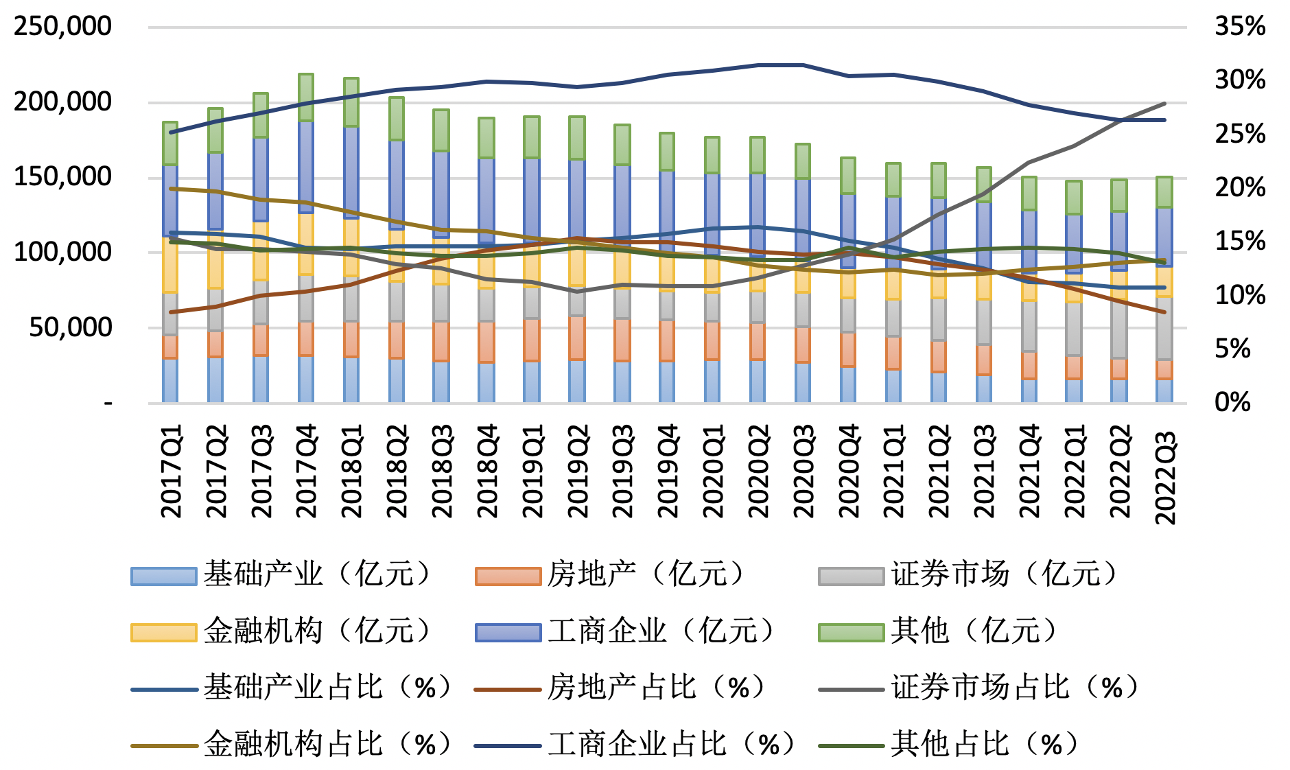 數(shù)據(jù)顯示,投向證券市場(chǎng)、金融機(jī)構(gòu)的規(guī)模和占比持續(xù)提升,投向工商企業(yè)、基礎(chǔ)產(chǎn)業(yè)、房地產(chǎn)領(lǐng)域的規(guī)模和占比進(jìn)一步下降。