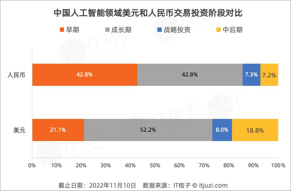 人民幣交易有42.8%投向了早期AI項目,有42.8%投向成長期的AI項目,相對均衡;美元交易52.2%投向了成長期的AI項目,早期AI項目僅占比21.1%,中后期的美元AI投資占比為18.8%,遠超人民幣交易的7.2%。