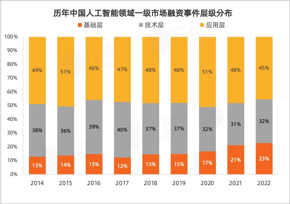 從AI各應(yīng)用層級的融資事件數(shù)來看,2022年風投第一偏好的國內(nèi)AI項目是更貼近行業(yè)的應(yīng)用層AI項目,其次是具備大規(guī)模商業(yè)化前景的技術(shù)層AI項目,最后才是基礎(chǔ)層AI項目。