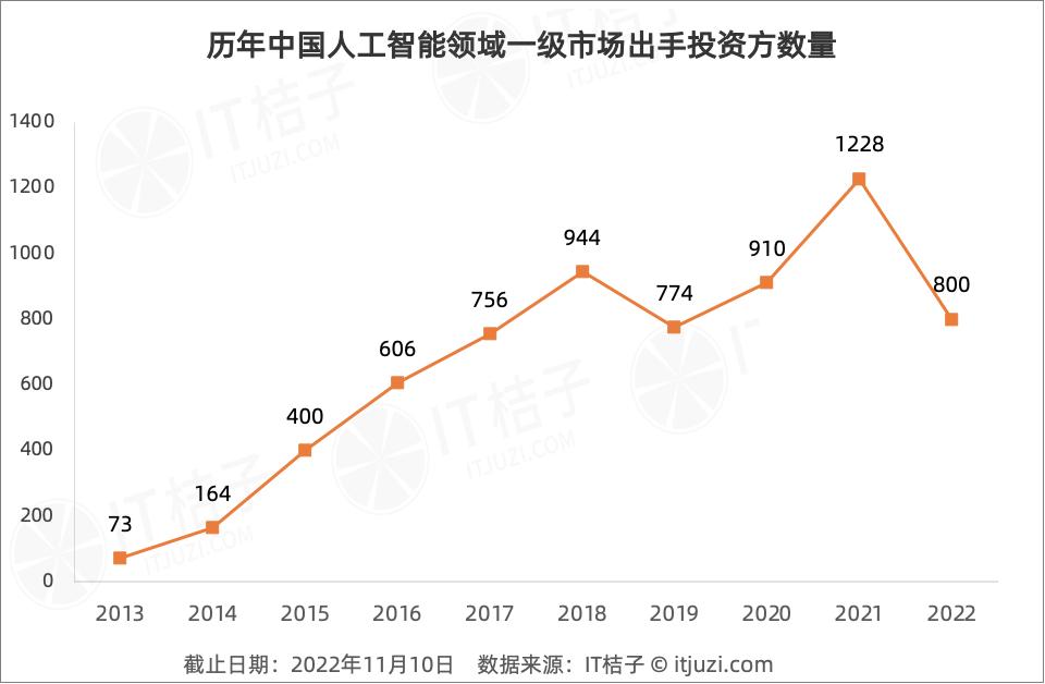 2022年,受到上海、北京等全國各地疫情的影響,出手AI的投資方下降至800家。