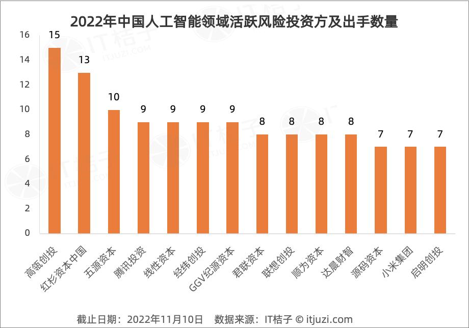 據(jù)IT桔子數(shù)據(jù),2022年中國人工智能領(lǐng)域最的活躍投資方是高瓴創(chuàng)投和紅杉資本中國,兩者在年內(nèi)的AI投資事件數(shù)量分別為15起、13起。
