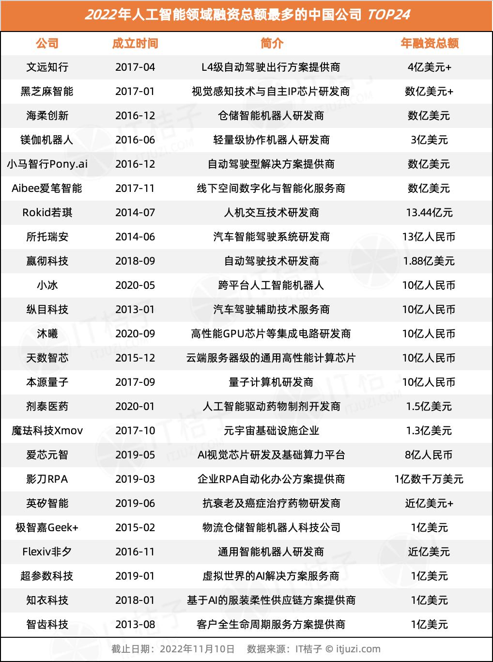 IT桔子數(shù)據(jù)顯示,截止2022年11月30日,人工智能賽道在2022年有14家新晉獨角獸公司,包括以下幾類: