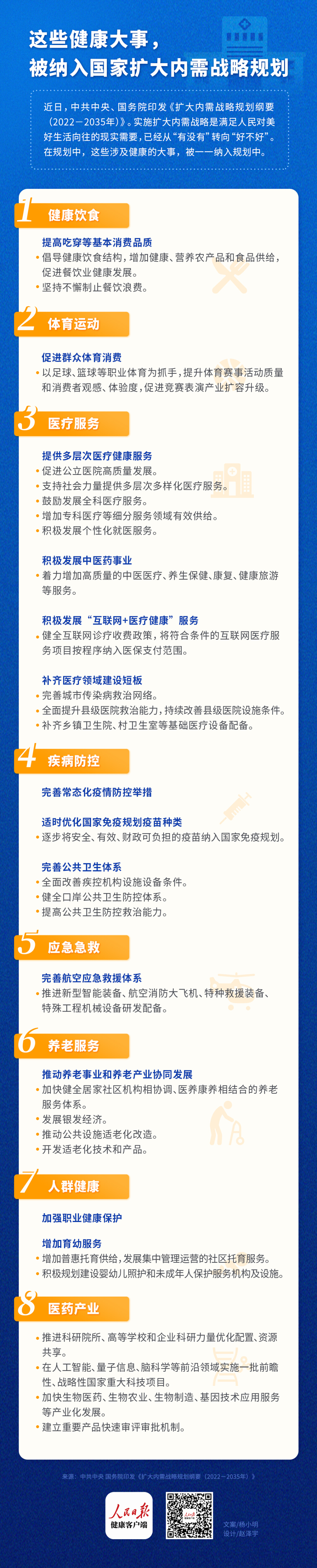 近日,中共中央、國務(wù)院印發(fā)《擴(kuò)大內(nèi)需戰(zhàn)略規(guī)劃綱要(2022-2035年)》。實施擴(kuò)大內(nèi)需戰(zhàn)略是滿足人民對美好生活向往的現(xiàn)實需要,從“有沒有”轉(zhuǎn)向“好不好”。在規(guī)劃中,這些涉及健康的大事,被一一納入規(guī)劃中。