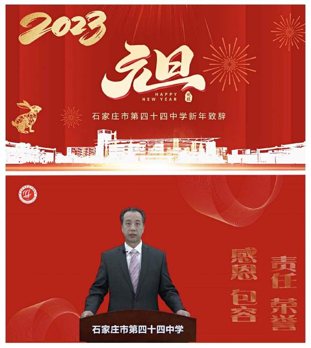 歲序更替,華章日新;新元肇啟,云程發(fā)軔。在新的一年里,石家莊市第四十四中學(xué)將以二十大精神為引領(lǐng),深入貫徹落實“雙減”政策,踐行德智體美勞“五育并舉”育人模式,實施“科研興?!惫こ蹋钊胪七M信息化教育教學(xué)改革,強化課題研究,抓根本、提素質(zhì),穩(wěn)步提升教學(xué)質(zhì)量;將繼續(xù)團結(jié)勤奮,求真務(wù)實,把握立德樹人的根本任務(wù),秉承“責任、榮譽、感恩、包容”的校訓(xùn),恪守“不苛求人人成才,但必須個個成人”的育人宗旨。站在“奔月向上”的新起點,創(chuàng)造美好未來,共繪四十四中揚帆致遠新畫卷!