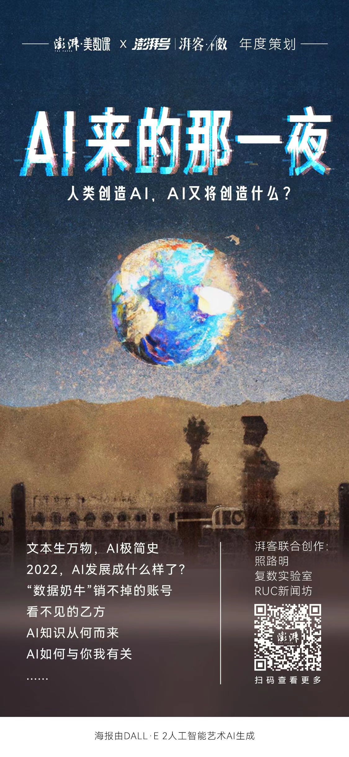 2022年,人工智能技術(shù)突飛猛進(jìn),更深入地介入人類生活。人類創(chuàng)造了AI,卻并不那么了解它,欣喜又畏懼。AI是誰?經(jīng)歷了怎樣的發(fā)展?對(duì)人類影響幾何?澎湃 · 美數(shù)課與湃客 · 有數(shù)聯(lián)合推出《AI來的那一夜》,去記錄AI當(dāng)下的發(fā)展、探尋人們對(duì)AI好奇的問題。