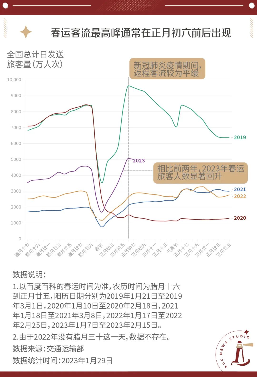 在2023年春運開始的前一天,春運工作專班副組長、交通運輸部副部長徐成光便在國新辦發(fā)布會上研判,2023年春運期間客流總量約為20.95億人次,比去年同期增長99.5%,恢復到2019年同期的70.3%。[3]春運返程的號角在春節(jié)假期結束后吹響,一般而言,春運客流量最高峰通常在正月初六前后出現(xiàn),2023年春運客流量也正是在正月初六達到最高峰。