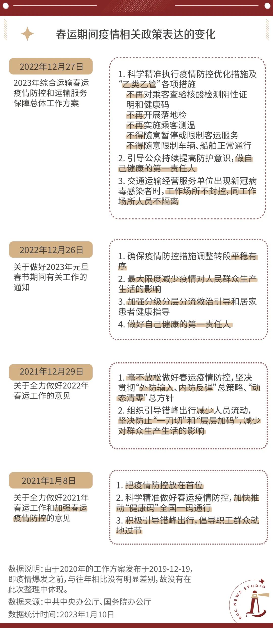 2023年1月8日成為疫情政策的轉折點,該日起新型冠狀病毒感染實施“乙類乙管”。春運期間各部門將科學精準執(zhí)行疫情防控優(yōu)化措施,乘客無需提供核酸檢測陰性證明和健康碼,不再開展落地核酸檢測。
