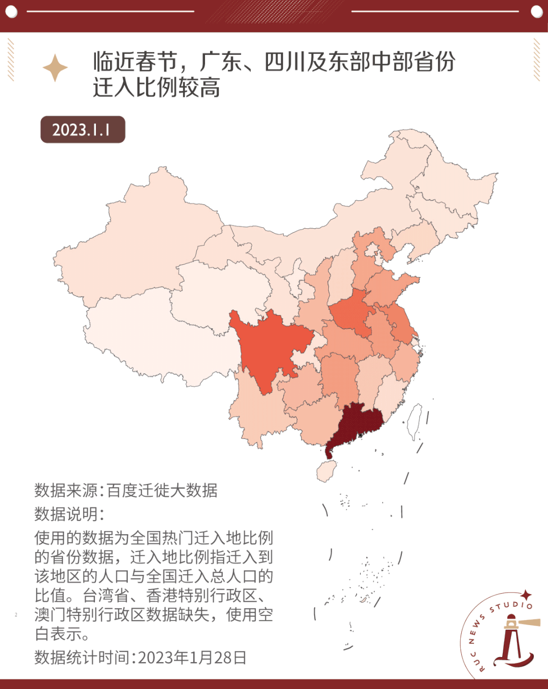 這波返鄉(xiāng)潮伴隨著春運的開始,從北上廣深涌向全國各地,其中遷入南方省份的比例在逐漸增高。我們通過統(tǒng)計百度遷徙大數(shù)據(jù)中今年全國熱門遷入地的比例,發(fā)現(xiàn)廣東、四川及東部中部省份遷入比例較高。