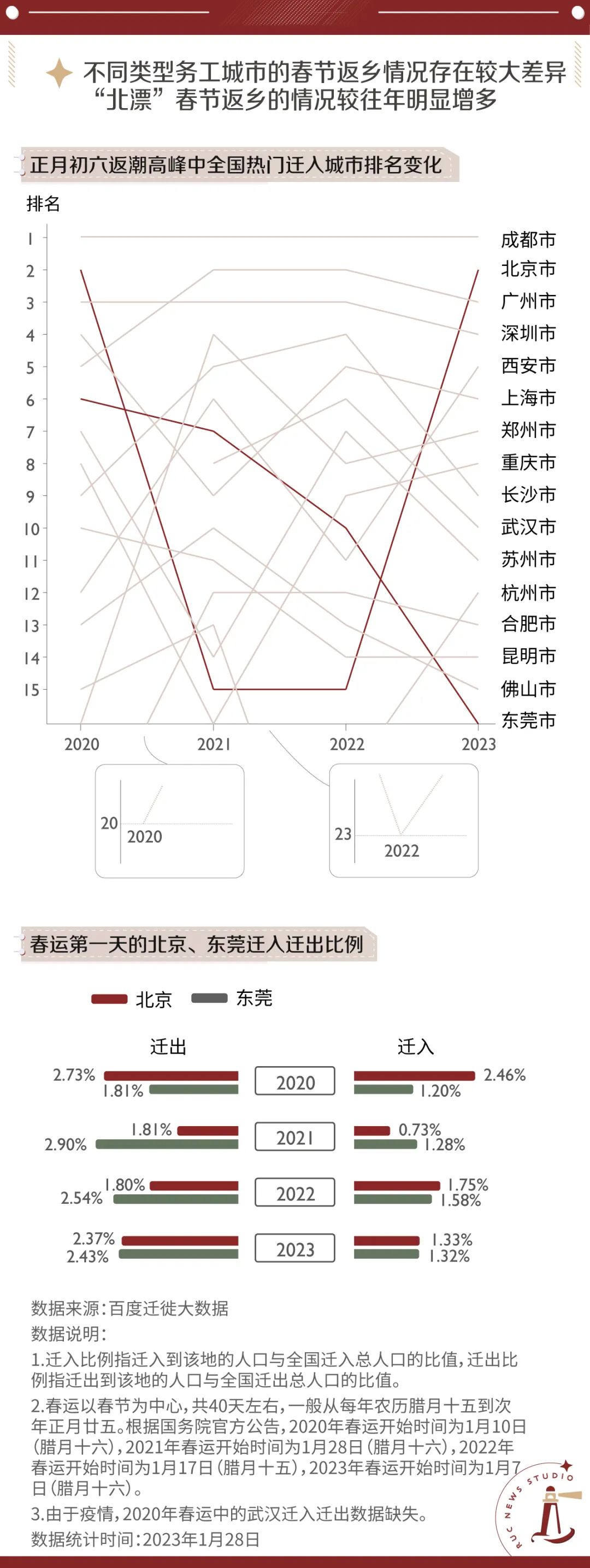 受疫情影響,北京在春運前期的人口遷出比例于2021、2022年出現(xiàn)明顯下降;前往北京旅游、探親的人員也大幅減少。而在今年,“反向春運”現(xiàn)象逐漸回歸,更多在北京的務工人員選擇將親人接至身邊共度新春;北京再次成為節(jié)后返程的熱門城市。