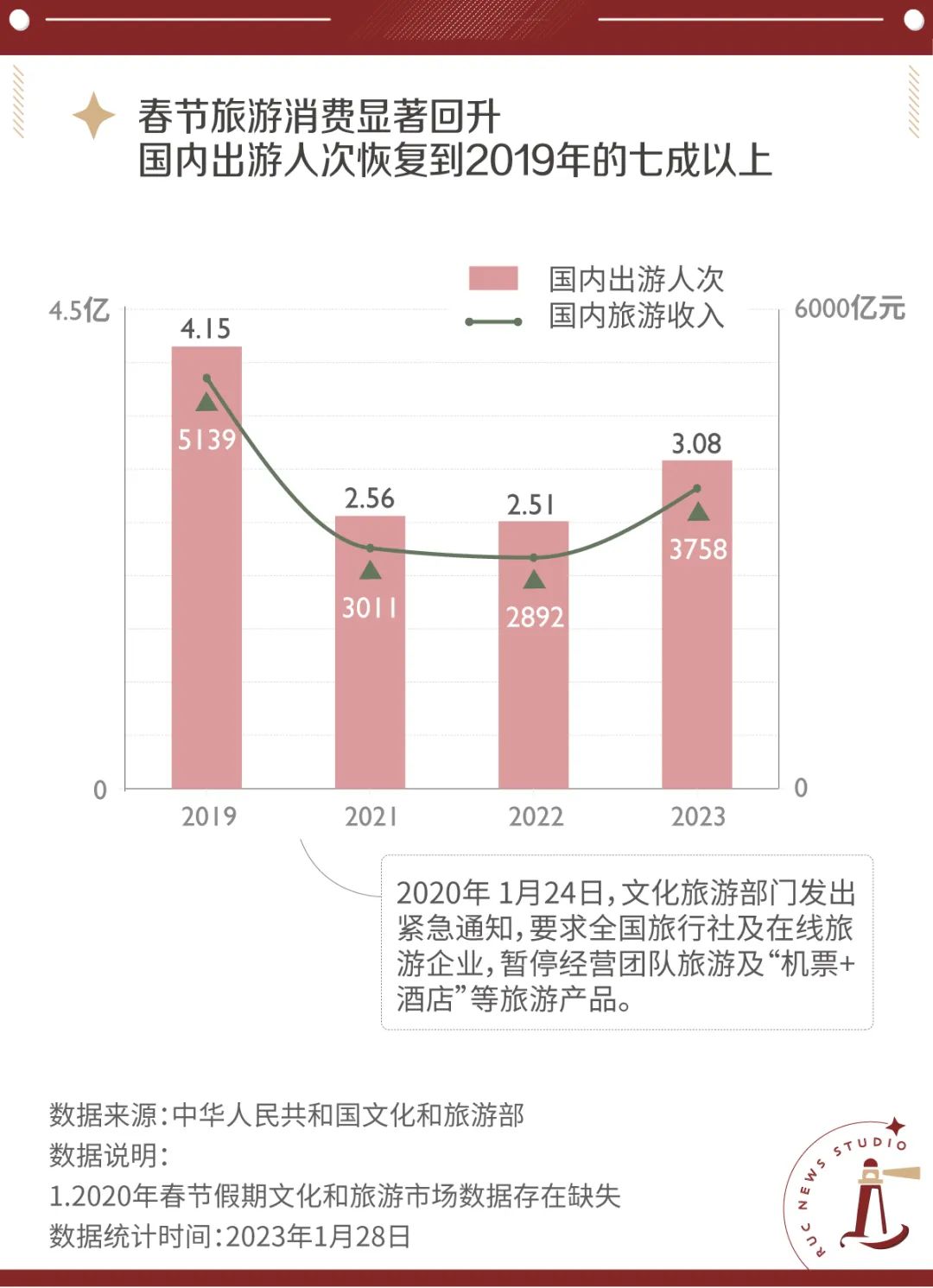 在“返鄉(xiāng)大軍”之外,“旅游大軍”也是今年春運的重要組成部分。出游,這個曾被限制的選項,重新成為了人們在假期感受節(jié)日氛圍,尋找各地煙火氣的選擇。文旅部的數(shù)據(jù)顯示,今年春節(jié)期間國內出游人次達到3.08億,恢復至2019年同期的88.6%。國內旅游收入相較2021和2022年也有所回升,達到3758億元。在同程旅行發(fā)布的《2023春節(jié)假期旅行消費數(shù)據(jù)報告》中,不僅海南、云南等冬季的傳統(tǒng)熱門目的地迎來大量游客,河南、山東等地旅游市場也大幅增長?!澳晡秲?、冰雪、溫泉、海島、爬山”成為了春節(jié)假期的關鍵詞。[6]