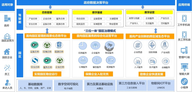 打造“三位一體”的園區(qū)治理模式,通過多種應(yīng)用終端為園區(qū)不同對象提供多元化服務(wù)和“軟件+硬件+運(yùn)營”三位一體的數(shù)字化服務(wù)。