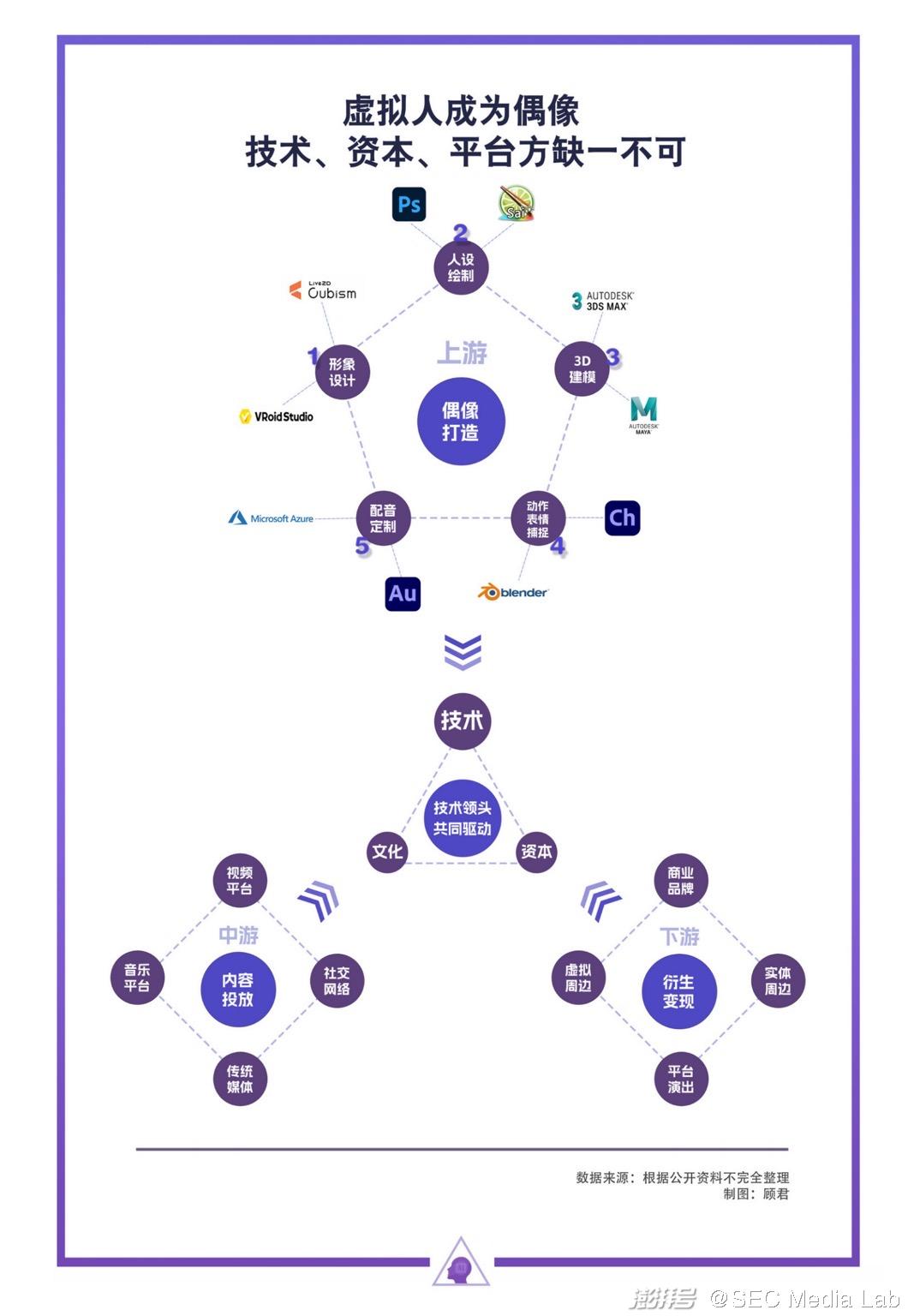虛擬偶像的生成則更加復(fù)雜,需要經(jīng)歷3D建模、動作捕捉、配音、簽約中之人等一系列流程。2020年被稱為虛擬偶像元年,短視頻、直播的爆火,讓虛擬偶像行業(yè)擁有拓維的潛力。AR、數(shù)字孿生、交互等技術(shù)的疊加,虛擬的模型產(chǎn)生了形象、動作、聲音,擬人要素的加成,迭代后變得靈動真實。但技術(shù)的加持只是初始態(tài)的人偶制作,要成為“偶像”還需各平臺內(nèi)容投放曝光,要稱得上“產(chǎn)業(yè)”就需要通過開發(fā)周邊、打造品牌、舉辦演出直播等活動來實現(xiàn)商業(yè)變現(xiàn)。多方合力之下,才能邁出虛擬偶像們頂流路的一小步。