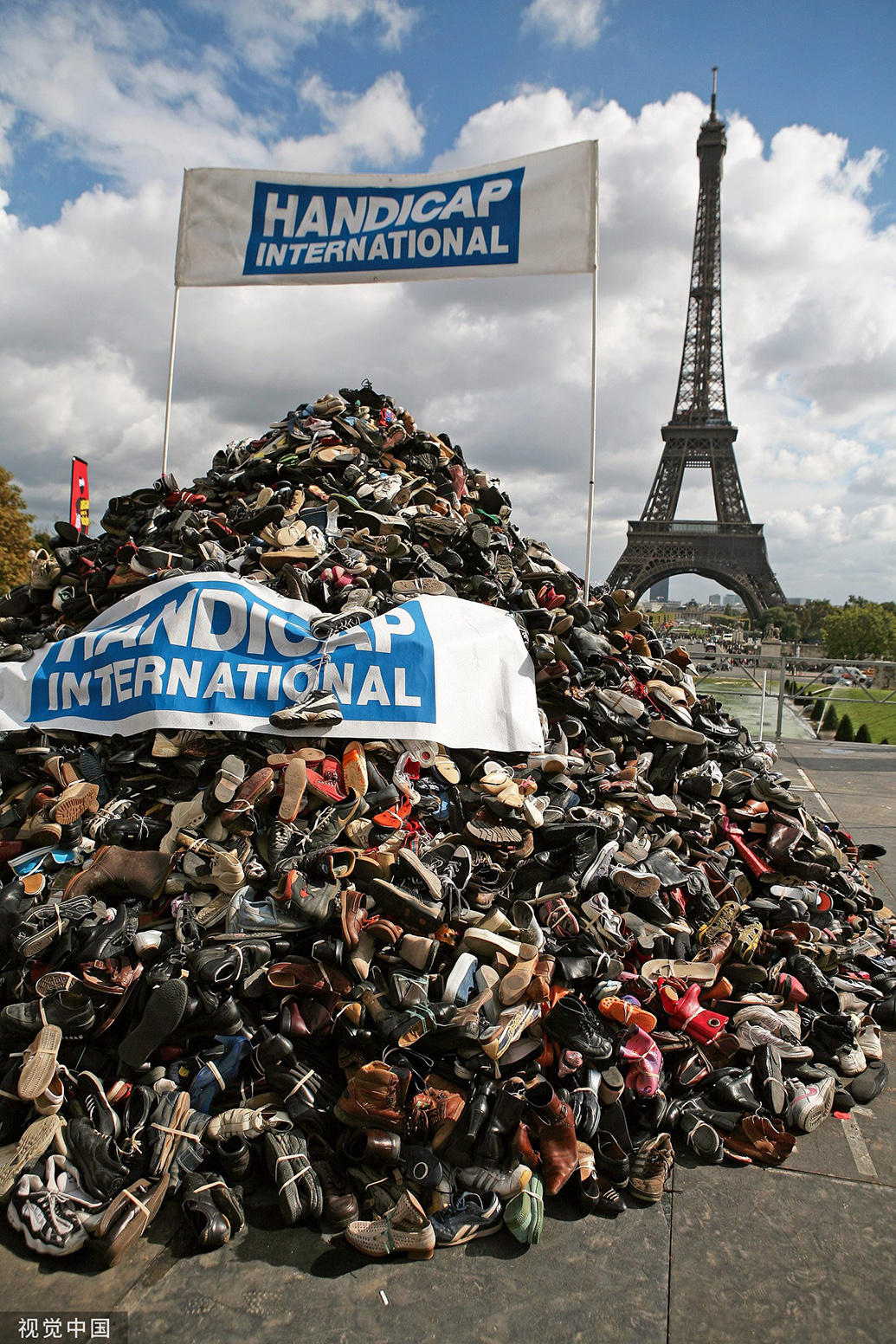 當(dāng)?shù)貢r(shí)間2010年9月25日,法國(guó)巴黎,國(guó)際殘疾協(xié)會(huì)成員在埃菲爾鐵塔前用鞋子堆成了一座金字塔,此舉意在譴責(zé)地雷和集束炸彈的使用。
