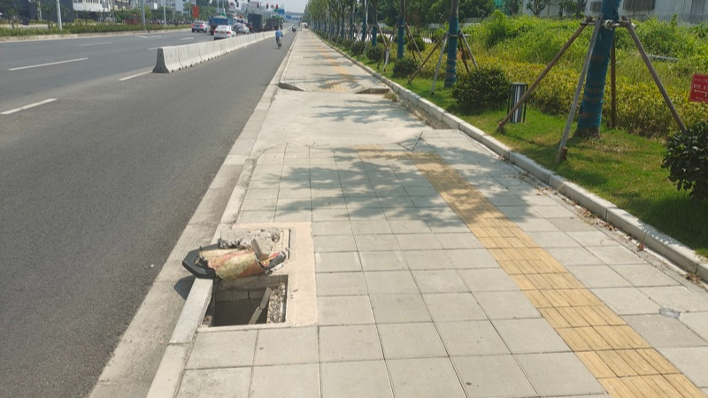 封浜地鐵站4號出口西側(cè),下水井裸露在人行道上。