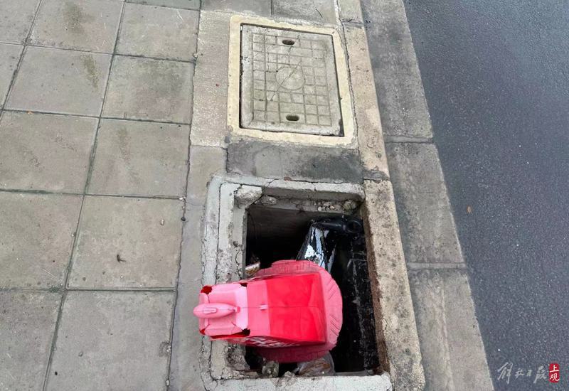 再向前走,不遠(yuǎn)處又是一處缺少井蓋的下水井。井里堆放了一些塑料制品,最上面放了一個“潛水艇地漏”的紅色塑料樁,提醒行人這里沒有井蓋。
