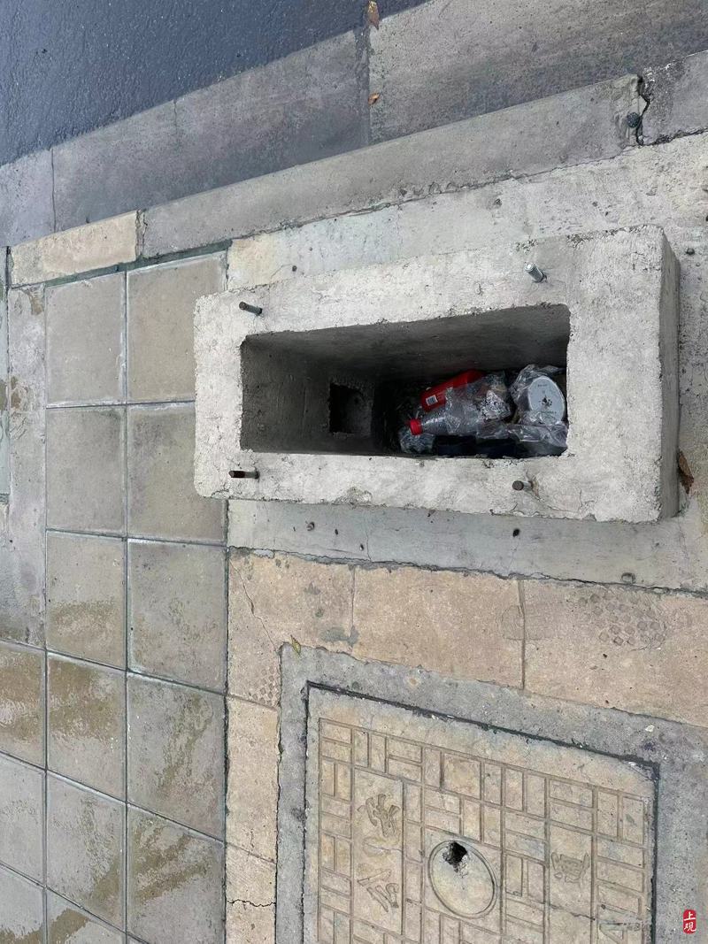 李先生所說的石墩堆放點位于曹安路3616號連成集團(tuán)外的人行道路段。記者繼續(xù)向西走,前往該處。路上,記者又看到了一處高于路面5厘米左右的方形水泥孔,不知留作何用,里面被丟棄了一些飲料瓶等垃圾。水泥孔邊緣伸出了4段3厘米長的細(xì)鋼筋,若夜間行人不小心被絆倒,這些裸露的鋼筋恐怕會造成更嚴(yán)重的傷害。