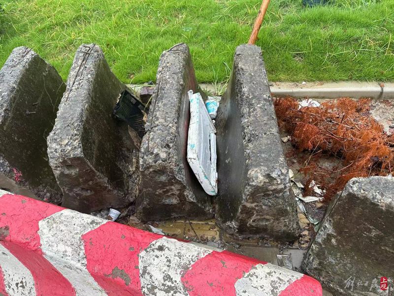 在連成集團(tuán)門口附近的交通信號燈下,人行道約一半寬度被8個橫豎無章的水泥石墩占據(jù),一個水泥墩旁面對道路立著“前方積水,立交禁行,車輛掉頭”的藍(lán)色交通標(biāo)識牌。不過周邊并沒有大面積積水,該標(biāo)識牌似乎是前一次使用后并未收走,遺留在此。水泥墩之間的縫隙中,不知被誰丟棄了白色泡沫板、超市一次性紙杯、黑色塑料筐、雪糕包裝袋、廢棄警示樁等垃圾,無人清理。