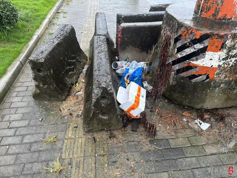 水泥石墩亂堆放在人行道上,大量垃圾被隨意丟棄無人清理。
