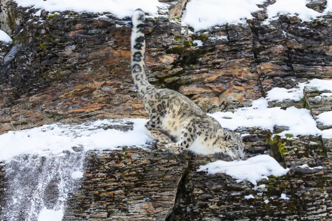 為了能看到雪豹,我在這座山上搭建了一個避風亭兼瞭望臺,就在雪線上,朝北從黑峽谷上方望過去,可以一直望到桑林寺山下蒼白的梯田。也許娑木渡的這些猛禽以為眼前風景中這團奇怪的東西——一個一動不動打坐的人體——是主持“天葬”時死去的人,因為一只羽毛油光水滑的銅黑色幼雕,高聲尖叫著向我一點點飛近,一只胡兀鷲從后面靠近,猛然振翅,俯沖而下,近距離掃過我的頭頂,似乎把空氣撕開了一道口子。那巨大的翅膀像裹尸布般沙沙作響,把我驚得一跳,這一跳,驚動了那只黑色的幼雕,它深深地慢劃了四次翅膀。胡兀鷲在喜馬拉雅的峽谷間上下翻飛,冷空氣在它金色的腦袋邊咻咻作響,它翅膀的動作,我是第一次也是最后一次看到。