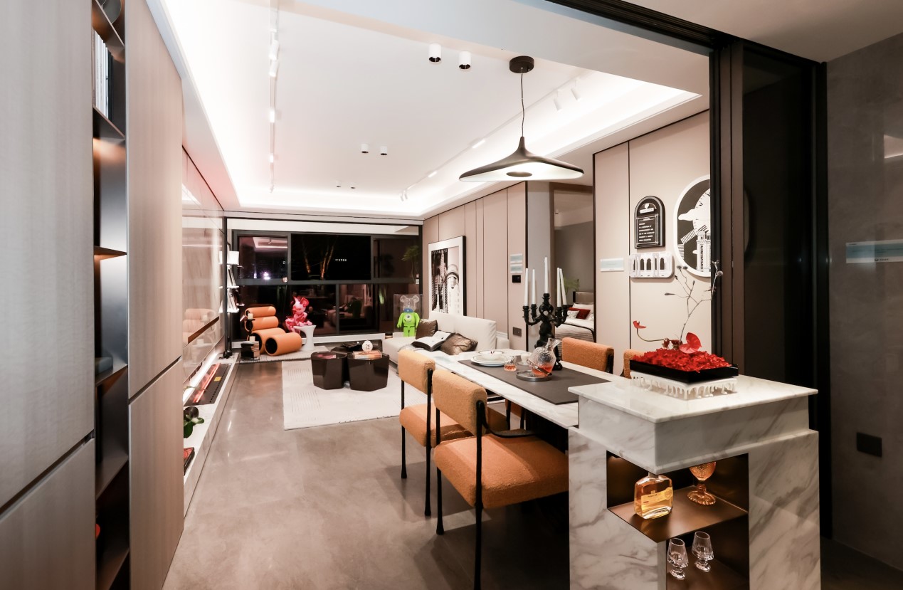 約103m2創(chuàng)新戶(hù)型,將原本3.3m-3.5m面寬的客餐廳空間,合并成一個(gè)5m*5m的方形空間,它不再以電視墻為主導(dǎo),可以根據(jù)不同業(yè)主的生活體驗(yàn)進(jìn)行功能布局,既保證了L型雙采光,并從結(jié)構(gòu)上顛覆了傳統(tǒng)客廳設(shè)計(jì),讓空間得以多元化應(yīng)用。