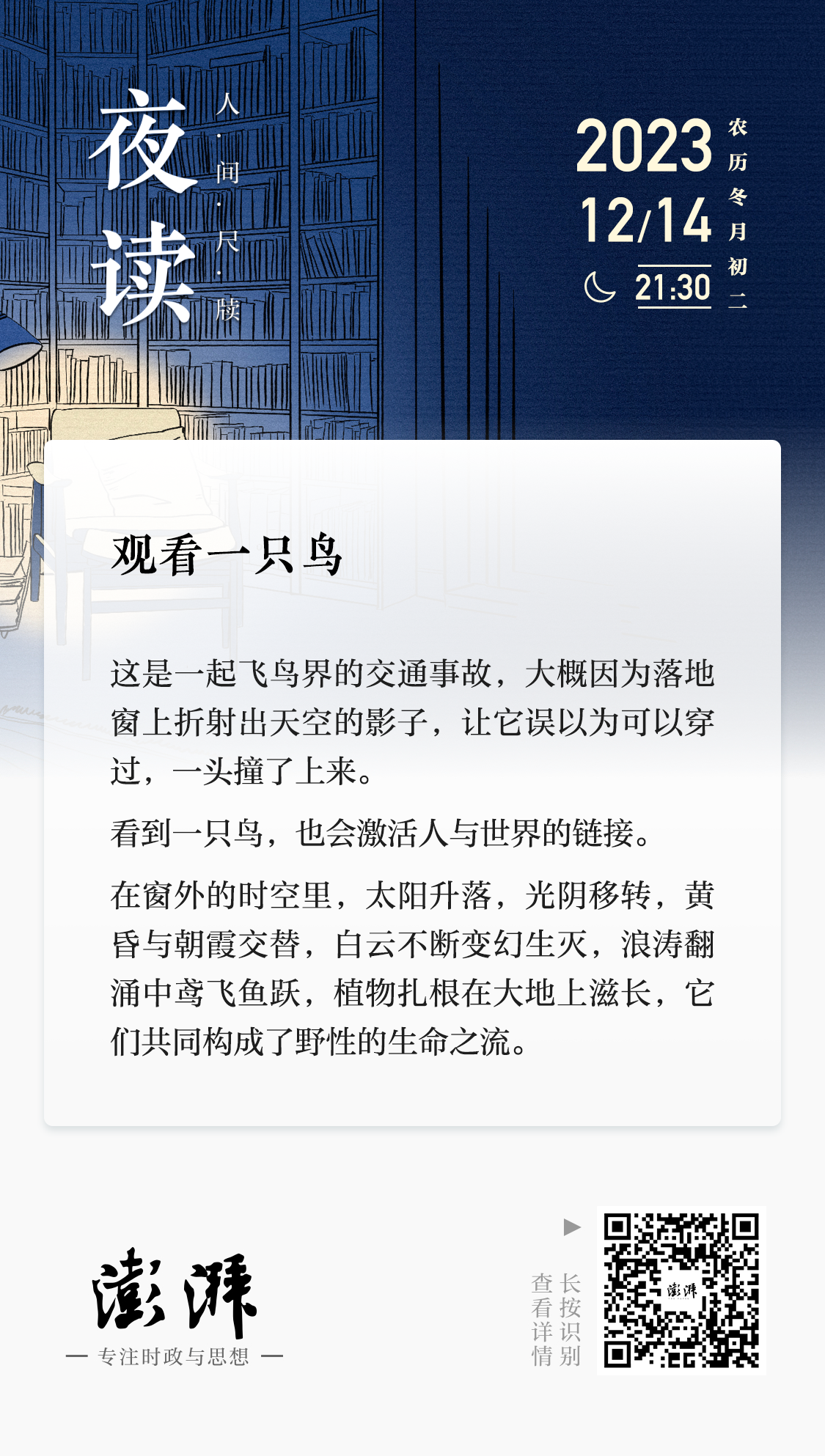 從工業(yè)文明到數(shù)字文明,人與自然其實(shí)一直處在不斷加深的隔閡中。人類社會(huì)像一個(gè)封閉的信息繭房,我們?cè)谄渲忻β?、焦慮、娛樂(lè)與悲喜。那天上午,當(dāng)鴿子撞上玻璃時(shí),我就正忙碌于自己的繭房中,電腦屏幕仿佛是唯一的地平線。直到撞擊聲響起,這個(gè)繭房才短暫出現(xiàn)了一道透光的裂隙。我恍然意識(shí)到,窗外還有一個(gè)更廣大的世界在同步運(yùn)轉(zhuǎn),就像是一個(gè)平行時(shí)空。只是在這場(chǎng)概率極小的意外之下,兩者才發(fā)生了相互干擾。