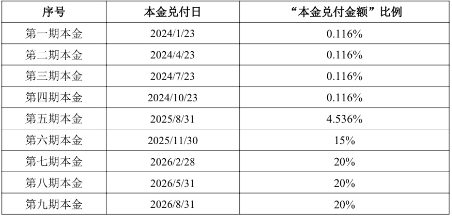 2025年8月31日,兌付第五期本金兌付金額自2023年8月31日(含) 至2025年8月31日(不含)產(chǎn)生的相關(guān)利息;