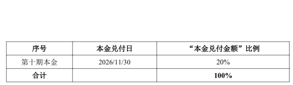 2026年11月30日,兌付第十期本金兌付金額自2023年8月31日(含) 至2026年11月30日(不含)產(chǎn)生的相關(guān)利息。