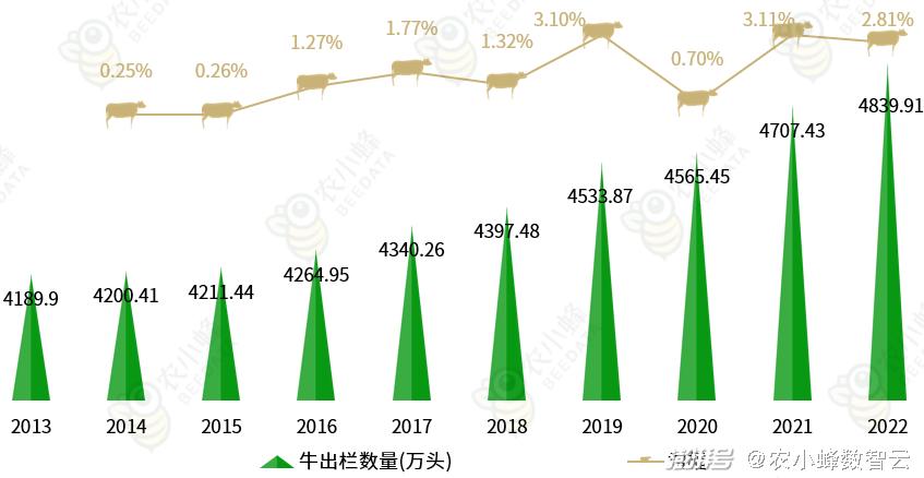 國家統(tǒng)計局數(shù)據(jù)顯示,2013~2022年以來,中國牛出欄量總體呈逐年增長趨勢,年增幅在0.7%~3.11%之間不等。2022年中國牛出欄量達4839.91萬頭,同比較2021年增長了132.48萬頭,增幅為2.81%。與2013年的4189.9萬頭相比,近9年間增量達650.01萬頭、增幅為15.51%,年均復合增長率為1.62%。